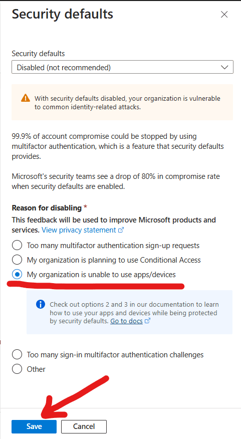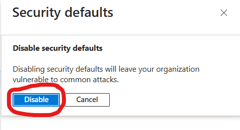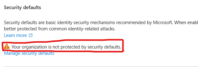 - Finally after disabling security defaults for your organisation Microsoft Entra Admin Center security defaults, should show a warning like this